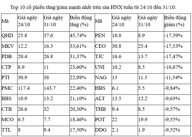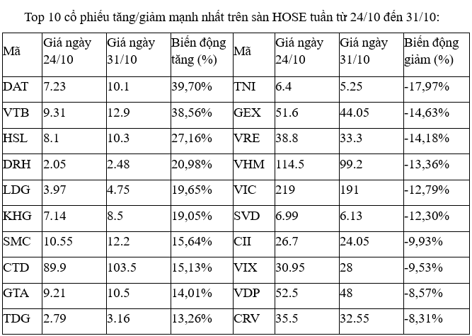 Trên sàn HOSE tuần cuối tháng 10, nhóm các cổ phiếu tăng tốt nhất hầu hết là các mã nhỏ, có tính đầu cơ cao với sự góp mặt của SMC, KHG, LDG, DRH, HSL, VTB, phản ánh sự dịch chuyển một phần của dòng tiền khi diễn biến ở các nhóm trụ, cổ phiếu đầu ngành khác đang khó lường.