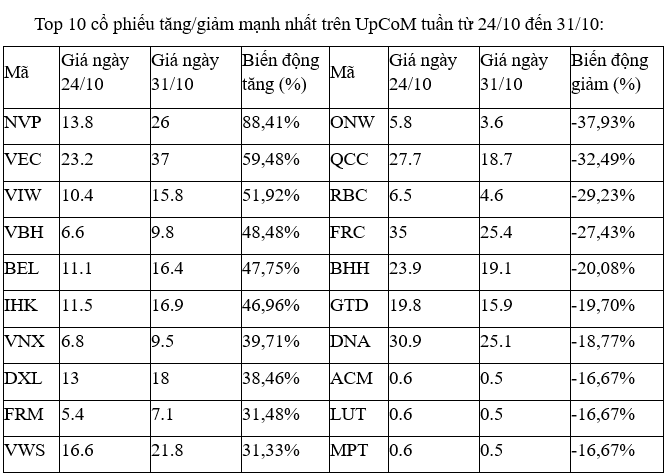 Trên UpCoM, cổ phiếu VEC có tuần thứ hai liên tiếp lọt top tăng cao nhất. Tổng cộng mã này liên tiếp tăng kịch trần từ phiên 23/10 đến 30/10, trước khi điều chỉnh giảm 8% trong phiên thứ Sáu. Tuần trước, cổ phiếu VEC tăng gần 28%.
