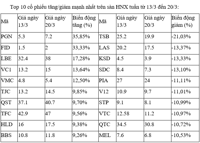 Trên sàn HNX, hai cổ phiếu nhỏ PGN và FID dẫn đầu đà tăng và bỏ xa phần còn lại, phản ánh dòng tiền dịch chuyển tìm kiếm cơ hội ở các cổ phiếu đầu cơ, trong bối cảnh thị trường chung, các cổ phiếu đầu ngành và cơ bản tốt chịu sức ép điều chỉnh.