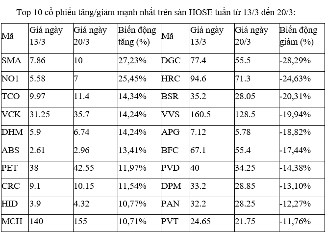 Trên sàn HOSE, cặp đôi nhỏ NO1 và SMA tăng vọt, cùng một số mã khác như thị giá thấp khác xuất hiện như TCO, ABS, DHM, CRC, HID theo sau, cho thấy một bộ phận nhà đầu tư tìm đến các cơ hội ngắn hạn ở những cổ phiếu có tính đầu cơ cao.