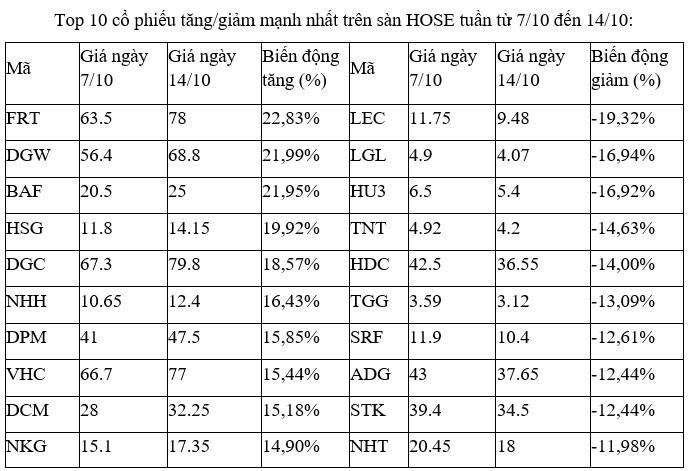 Trên sàn HOSE, nhóm cổ phiếu tăng mạnh nhất đều là các mã đầu ngành ở các nhóm bán lẻ như FRT, DGW, nguyên vật liệu với HSG, NKG, DCM, DPM, DGC, NHH và nông nghiệp là VHC và BAF.
