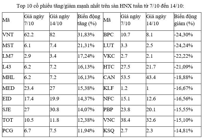 HNX-Index tăng 1,8 điểm (+0,8%), lên 227,89 điểm. Giá trị giao dịch trên HNX giảm 11,4% so với tuần trước xuống 4.748 tỷ đồng, khối lượng giảm 3,5% xuống 300 triệu cổ phiếu.