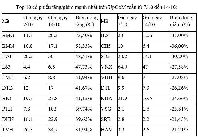 Trên UpCoM, nhóm các cổ phiếu tăng, giảm mạnh nhất đáng kể có LMH, khi gần như là cổ phiếu duy nhất có thanh khoản tốt trong các phiên giao dịch.
