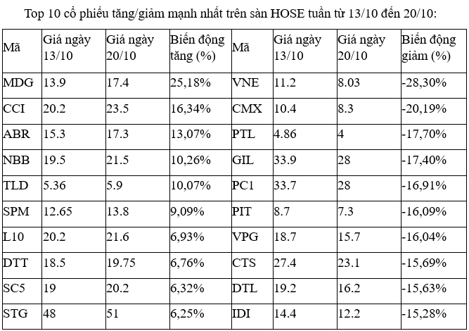 Trên sàn HOSE, phản ánh tuần giao dịch đầy trắc trở khi các mã tăng tốt nhất phần lớn chỉ có biên độ 6-10%. Chỉ có MDG vượt trội, nhưng mã này thanh khoản chỉ vài nghìn đơn vị khớp lệnh/phiên. Điều tương tự cũng diễn ra với hai mã phía sau là CCI và ABR.
