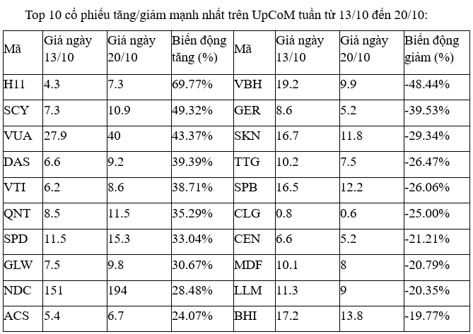 Trên UpCoM, nhóm cổ phiếu tăng, giảm mạnh nhất đáng kể có một vài cổ phiếu có thanh khoản tương đối tốt như VUA ở nhóm công ty chứng khoán khi tăng mạnh hơn 40% và ngược lại là CEN giảm hơn 20%.