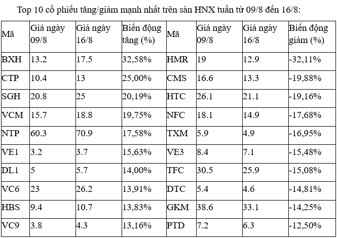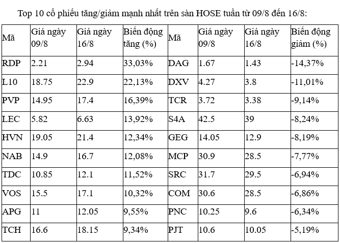 Trên sàn HOSE, cổ phiếu nhỏ, có tính đầu cơ cao là RDP đã tăng vọt và bỏ xa phần còn lại với cả năm phiên đều tăng, với ba phiên 13, 14 và 15/8 đều tăng kịch trần. Cổ phiếu này bật lên sau khi về vùng 2.200 đồng vào tuần trước, mức thấp nhất kể từ năm 2012 tới nay.