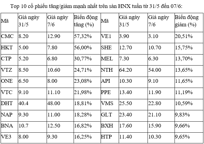 Trên sàn HNX, nhóm các mã tăng đa phần là các cổ phiếu nhỏ, giao dịch tương đối mờ nhạt với thanh khoản thấp trong các phiên như CMC, HKT, VTC, ONE, VE3, NAP…còn những cổ phiếu như CTP, VTZ, BNA khớp lệnh trung bình trên dưới 0,1 triệu đơn vị/phiên.