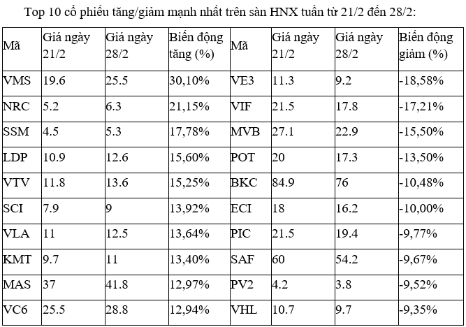 Ở chiều ngược lại, cổ phiếu KPF thêm một tuần là cổ phiếu giảm sâu nhất sàn, dù đã nhận án đình chỉ giao dịch kể từ ngày 26/2.