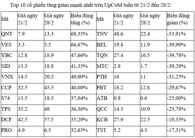 Trên UpCoM, cổ phiếu ngành khoáng sản YBC tiếp tục thu hút sự chú ý. Tổng cộng cổ phiếu này ghi nhận 8 phiên liên tiếp tăng kịch trần từ 18/2 đến 27/2 và dù đã chịu áp lực bán chốt lời, giảm sàn trong phiên cuối tuần, nhưng vẫn ghi nhận mức tăng gần 50%. Tuần trước, cổ phiếu này cũng có mức tăng hơn 48%.