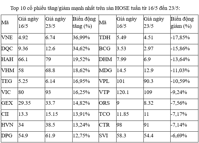 Trên sàn HOSE, nhóm các cổ phiếu tăng đáng chú nhất có sự góp mặt đáng chú ý của cặp đôi nhà Vingroup là VIC và VHM. Trong đó, VHM được mua bắt đáy mạnh sau khi thuộc nhóm mã giảm sâu nhất vào tuần trước đó dù chỉ mất gần 7%.
