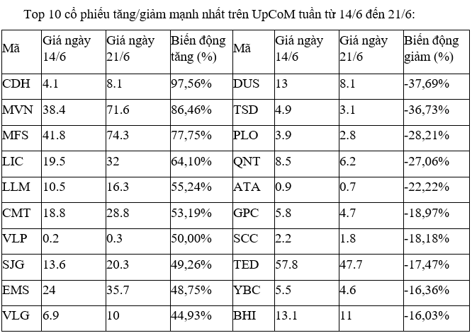 Trên UpCoM, cổ phiếu tăng mạnh nhất với gần 100% là CDH của CTCP Công trình công cộng Dịch vụ Du lịch Hải Phòng. Tổng cộng, cổ phiếu này đã có tám phiên liên tiếp tăng kịch trần gần nhất, nhưng khớp lệnh chỉ 100 đơn vị/phiên.