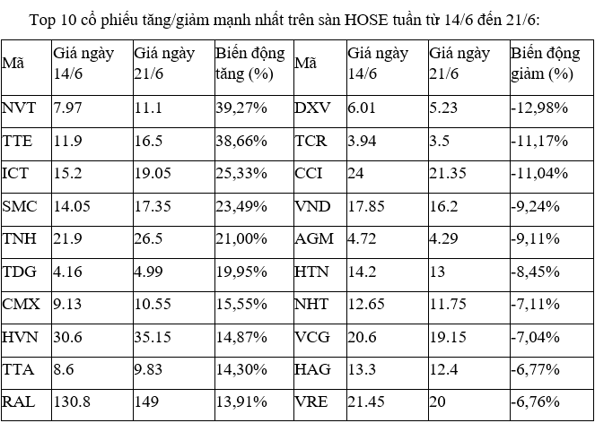Trên sàn HOSE, thêm một tuần các nhà đầu tư tìm đến các cổ phiếu vừa và nhỏ, với NVT, TTE, TDG, CMX, TTA. Trong đó, cổ phiếu TTE ghi nhận chuỗi 9 phiên liên tiếp tăng kịch trần, nhưng thanh khoản lại chỉ dừng lại ở mức vài nghìn đơn vị khớp lệnh/phiên.