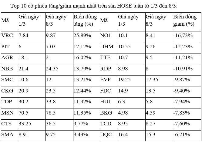 Ở chiều ngược lại, nhóm cổ phiếu NO1, RDP, EVF, FDC, DHM, BKG bị chốt lời và giảm khá mạnh. Trong đó, cổ phiếu DHM tuần trước đó còn thuộc top những mã tăng tốt nhất với mức tăng gần 19%.