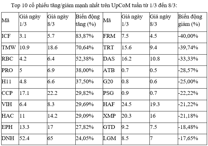 Trên UpCoM, đa phần các mã tăng, giảm mạnh nhất tuần này đều chỉ có thanh khoản yếu. Ngoại trừ ICF, khi là mã tăng vượt trội và thanh khoản ở mức trên dưới 0,4 triệu đơn vị/phiên. Tổng cộng, cổ phiếu này đã có 7 phiên liên tiếp gần nhất đều đóng cửa ở mức giá trần.
