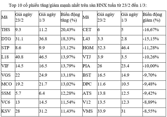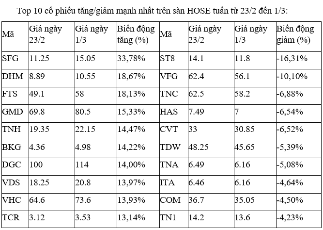 Tuần qua, trên thị trường, nổi bật nhất là nhóm cổ phiếu công ty chứng khoán khi nhiều mã tăng giá mạnh và không ít vượt vùng giá đỉnh lịch sử, đỉnh gần nhất như FTS (+18,13%), VDS (+13,97%), BSI (+12,14%), CTS (+11,2%), TVS (+10,6%), BVS (+9,73%), SSI (+9,4%), AGR (+9,4%), VCI (+7,6%), ORS (+6,7%), VND (+5,2%)...