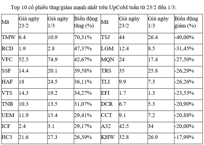 Trên UpCoM, giao dịch ở nhóm cổ phiếu tăng, giảm mạnh nhất tuần này không có diễn biến đáng kể nào, khi đều chỉ giao dịch thưa thớt với thanh khoản thấp trong các phiên.