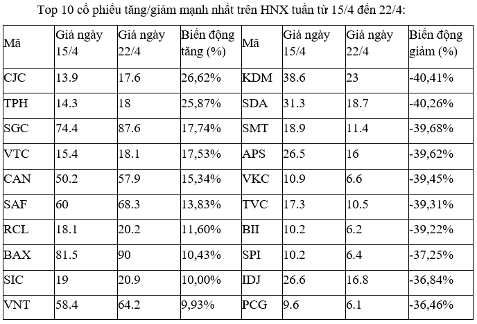 HNX-Index giảm 57,59 điểm (-13,8%), xuống 359,12 điểm. Giá trị giao dịch trên HNX đạt 12.746 tỷ đồng, tăng 38,9% so với tuần trước , khối lượng tăng 69,3% lên 531 triệu cổ phiếu.