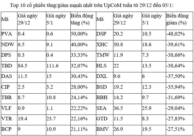 Trên UpCoM, phần lớn các cổ phiếu tăng, giảm mạnh nhất đều giao dịch khá ảm đạm, ngoại trừ VTR khi bất ngờ khớp lệnh trung bình hơn 0,1 triệu đơn vị trong các phiên.