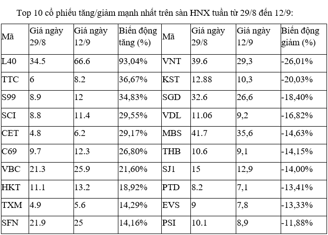 Trên sàn HNX, cổ phiếu L40 đột ngột tăng mạnh và bỏ xa phần còn lại, thị giá tăng gần gấp đôi sau kỳ nghỉ lễ lên 66.600 đồng, với liên tiếp là những cây nền xanh, dù thời gian gần đây không có thông tin mới nào đáng kể. Trong khi thanh khoản trồi sụt, nhưng phần lớn duy trì ở mức trên dưới 0,4 triệu đơn vị/phiên.