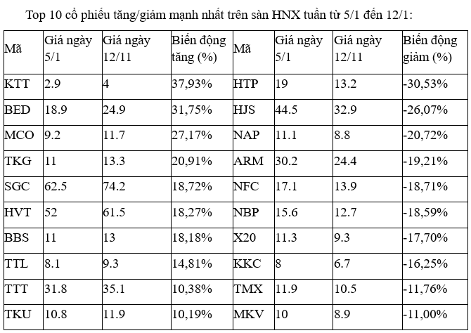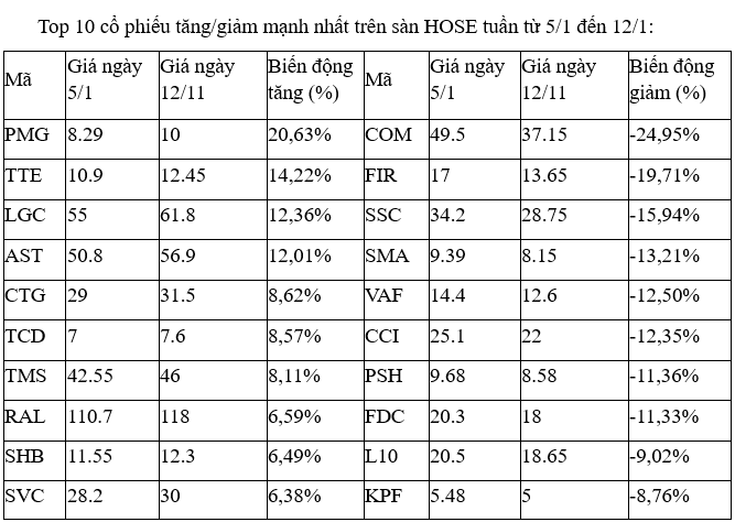 Trên sàn HOSE, phản ánh dòng tiền tập trung vào các mã ngân hàng thời gian gần đây, nhóm cổ phiếu tăng mạnh nhất tuần này đã có hai cái tên trong nhóm này góp mặt, đó là cổ phiếu ngân hàng SHB, dù chỉ tăng 6,5% nhưng mã này có phiên giao dịch ngày 10/1 với khối lượng khớp lệnh đạt kỷ lục khi có hơn 94,3 triệu đơn vị.