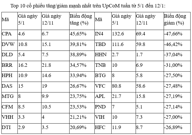 Trên UpCoM, thêm một tuần các cổ phiếu tăng, giảm mạnh nhất đều giao dịch với thanh khoản thấp, trừ phần nào đó là DTI, khi ba phiên cuối tuần khớp trung bình 0,3 triệu đơn vị/phiên.