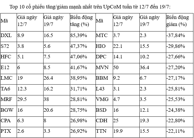 Trên UpCoM, các cổ phiếu tăng, giảm mạnh nhất tuần này tiếp tục giao dịch với thanh khoản thấp và không ít còn trắng giao dịch trong một số phiên.