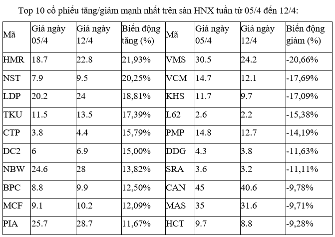 Trên sàn HNX, cổ phiếu DDG tiếp tục giảm sâu, sau tuần trước đó giảm hơn 12%. Trong khi ngược lại, HMR được mua bắt đáy mạnh, trở thành cổ phiếu tăng tốt nhất sàn sau khi mất gần 17% và là cổ phiếu giảm mạnh nhất thứ trên sàn vào tuần trước.