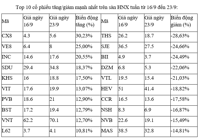 Chỉ số HNX-Index giảm 8,44 điểm (-3,09%) xuống 264,44 điểm. Giá trị giao dịch trên HNX giảm 10,5% so với tuần trước xuống 6.579 tỷ đồng, khối lượng giảm 5,5% xuống 317 triệu cổ phiếu.
