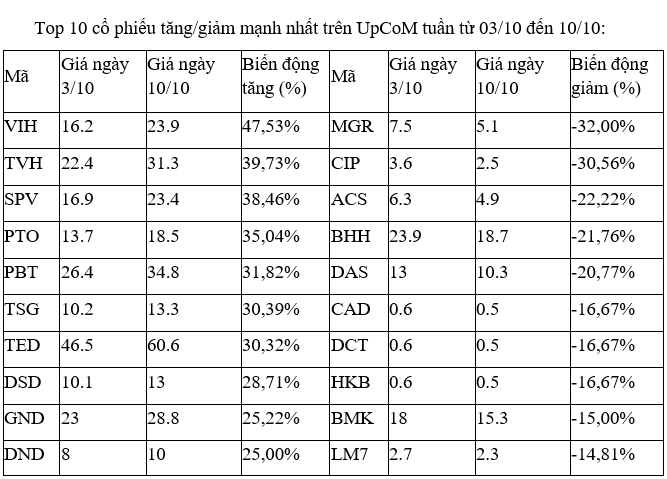 Trên UpCoM, các cổ phiếu tăng, giảm mạnh nhất tuần đều giao dịch ảm đạm, thanh khoản thấp, thậm chí nhiều mã còn trắng thanh khoản trong các phiên.