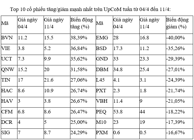 Trên UpCoM, nhóm các cổ phiếu tăng, giảm mạnh nhất tuần này trở lại với trạng thái thanh khoản rất thấp, không có diễn biến diễn đáng chú ý nào về mặt dữ liệu, nội tại doanh nghiệp.
