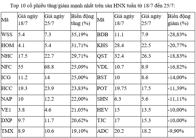 Trên sàn HNX, cổ phiếu WSS của CTCP Chứng khoán Phố Wall ghi nhận tuần khởi sắc, dẫn đầu mức tăng trên sàn nhờ lực cầu chung hướng vào nhóm cổ phiếu công ty chứng khoán. Cổ phiếu này liên tiếp có ba phiên tăng kịch trần 21, 22 và 23/7. Tuy nhiên, thanh khoản không cao, chỉ có từ 0,1 triệu đến 0,4 triệu đơn vị khớp lệnh/phiên trong cả tuần.