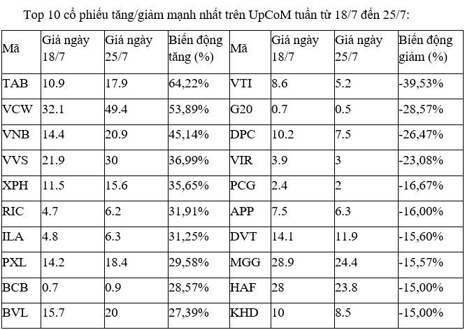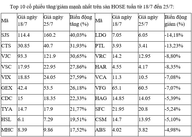 Trong khi đó, quán quân tăng giá là SJS với mức tăng 40%, nhưng thanh khoản chỉ ở mức thấp. Thông tin mới nhất liên quan là vào ngày 31/7 tới đây, SJS sẽ chốt danh sách cổ đông trả cổ tức bằng cổ phiếu và phát hành cổ phiếu tăng vốn từ nguồn vốn chủ sở hữu theo tỷ lệ tổng cộng 100:159.