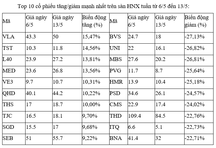 Top 10 cổ phiếu tăng/giảm mạnh nhất trên UpCoM tuần từ 6/5 đến 13/5: