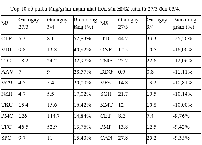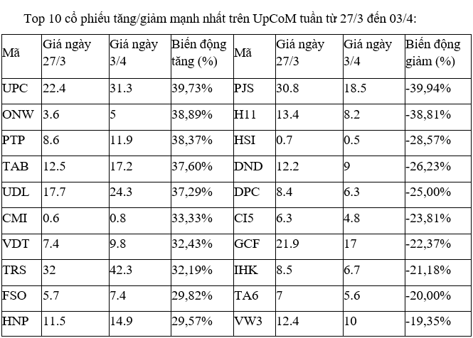 Trên UpCoM, nhóm các cổ phiếu biến động mạnh nhất tuần qua đều chỉ có thanh khoản thấp, thậm chí không ít cổ phiếu còn trắng giao dịch trong các phiên.