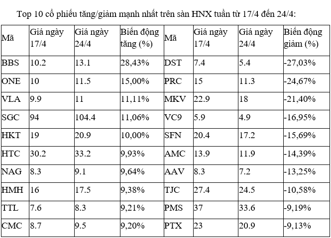 Trái lại, hai cổ phiếu bị chốt lời sau tuần tăng mạnh trước đó là PRC, AAV. Trong đó, cổ phiếu AAV chỉ vào giữa tháng 5 tới sẽ chính thức không còn giao dịch trên sàn do nhận quyết định hủy niêm yết bắt buộc.