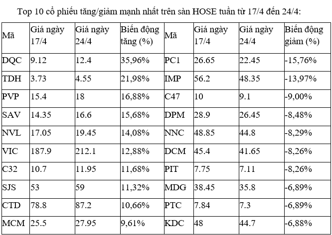 Trên sàn HOSE, nhóm cổ phiếu tăng tốt nhất vẫn phải gọi tên cổ phiếu vốn hóa lớn nhất thị trường là VIC với mức tăng gần 13%. Cổ phiếu này đã có liên tiếp hai tuần nằm trong số những mã tăng cao nhất sàn, tuần trước VIC là quán quân với mức tăng gần 24%.