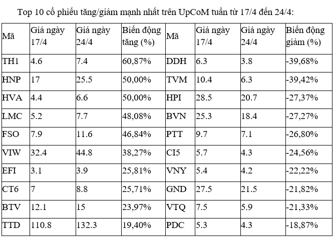 Trên UpCoM, cổ phiếu TH1 dẫn đầu với diễn biến đáng chú ý khi tăng kịch trần liên tiếp từ 14/4 đến 22/4, ghi nhận tuần thứ hai liên tiếp là cổ phiếu tăng cao nhất. Tuy nhiên, thanh khoản vẫn chỉ dừng lại ở mức thấp.