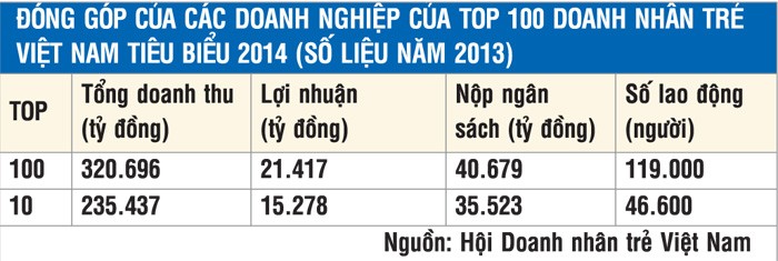 Những con số doanh thu, nộp ngân sách của 100 doanh nghiệp do 100 doanh nhân trẻ Việt Nam tiêu biểu năm 2014 làm chủ hoặc là người “đứng mũi chịu sào” gây bất ngờ cho cả Ban tổ chức - Ủy ban Trung ương Hội Doanh nhân trẻ Việt Nam.