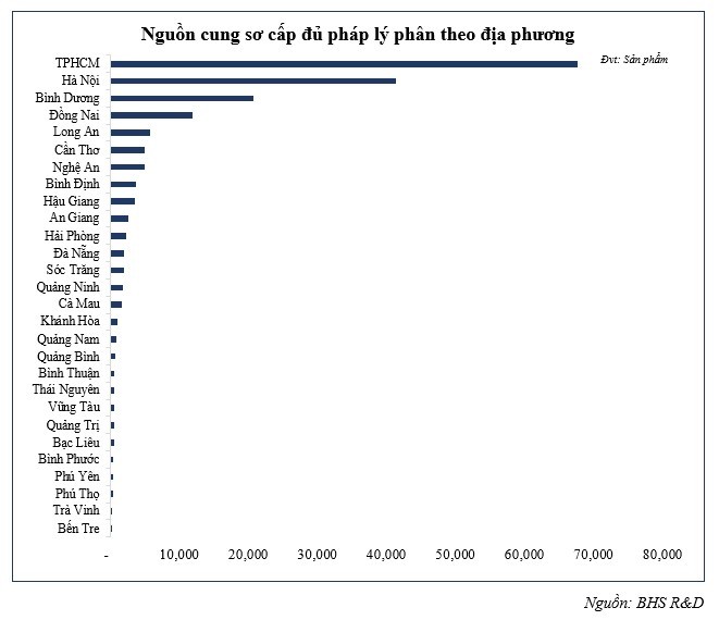 Cụ thể hơn, BHS R&D đã thống kê nguồn cung nhà ở sơ cấp đủ pháp lý phân theo địa phương chi tiết: TP.HCM dẫn đầu với gần 68.000 sản phẩm đủ pháp lý, chiếm 38% tổng nguồn cung đủ pháp lý cả nước, trong đó đến 97% là các sản phẩm cao tầng. Hà Nội có hơn 41.000 sản phẩm nhà ở sơ cấp đủ pháp lý và cũng có tới 91% trong đó là sản phẩm chung cư.