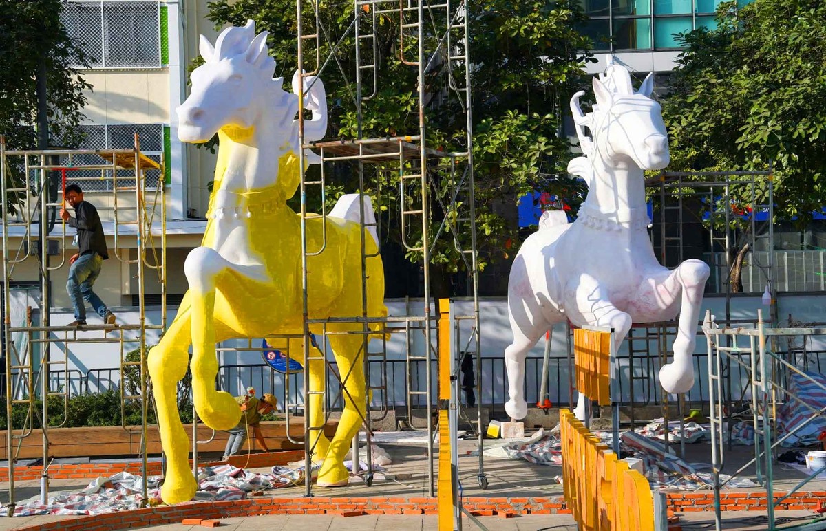 Linh vật Ngựa Bính Ngọ cùng nhiều cụm trang trí quy mô lớn dần lộ diện, tạo diện mạo rực rỡ giữa trung tâm thành phố.