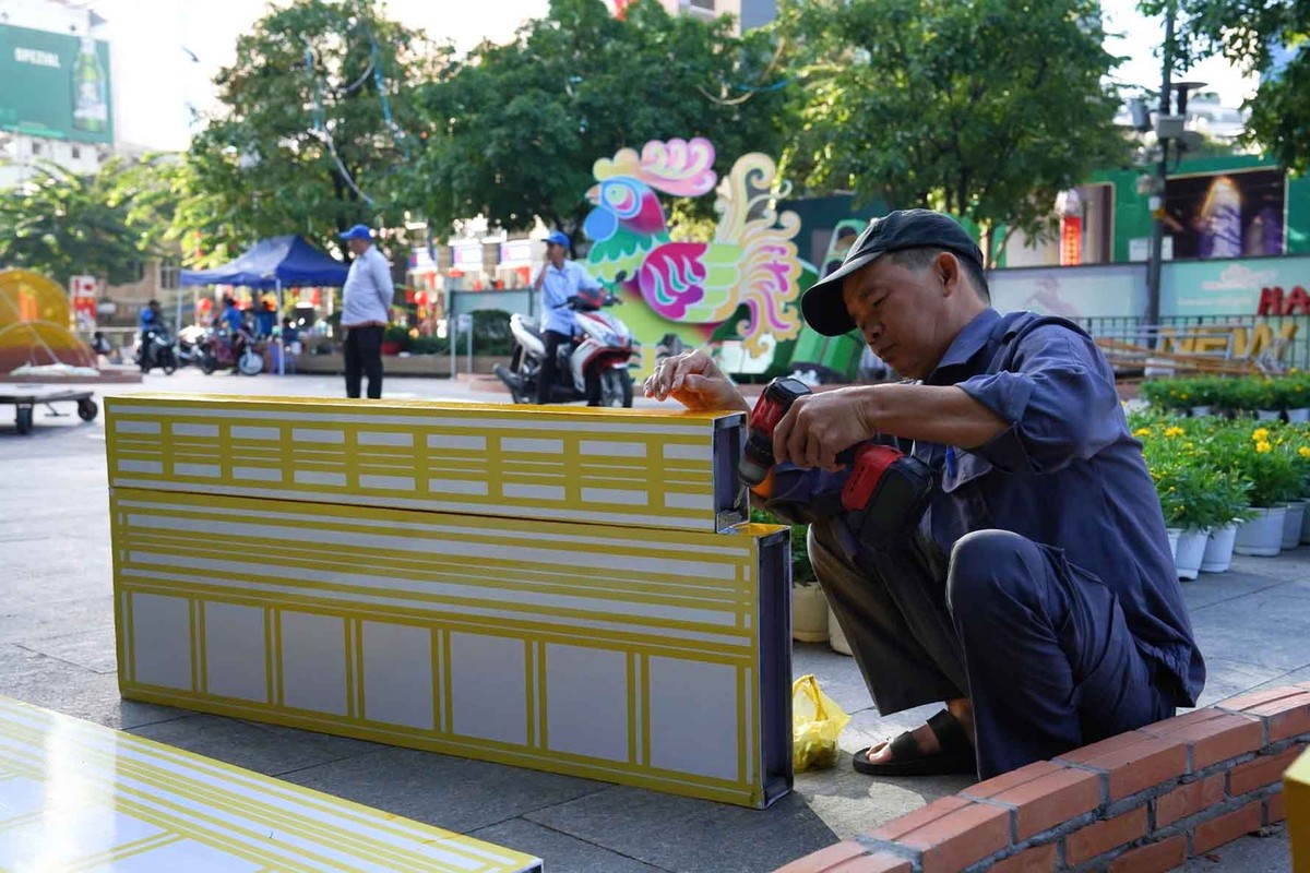 Trước giờ khai mạc đường hoa Nguyễn Huệ Tết Bính Ngọ, không khí thi công trở nên khẩn trương. Dưới ánh nắng, các tổ thợ tất bật lắp đặt linh vật ngựa, chỉnh sửa tiểu cảnh, hoàn thiện từng chi tiết trang trí cuối cùng.