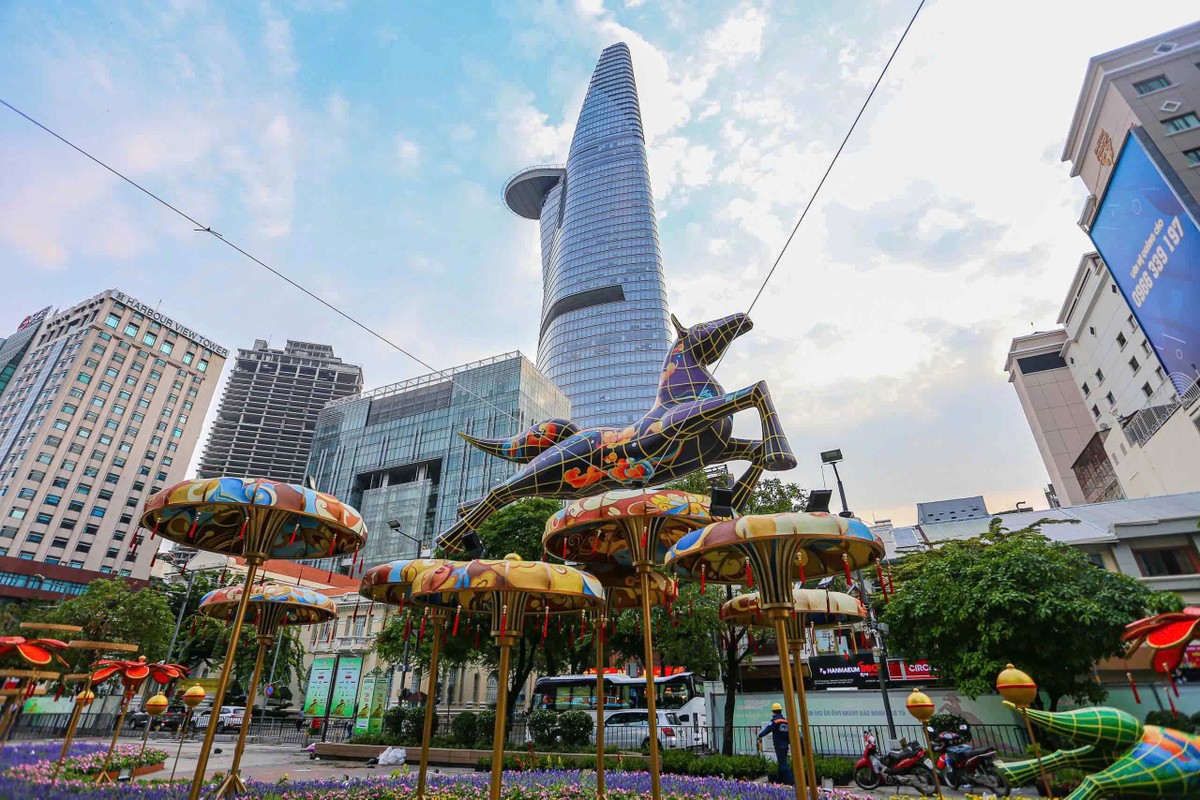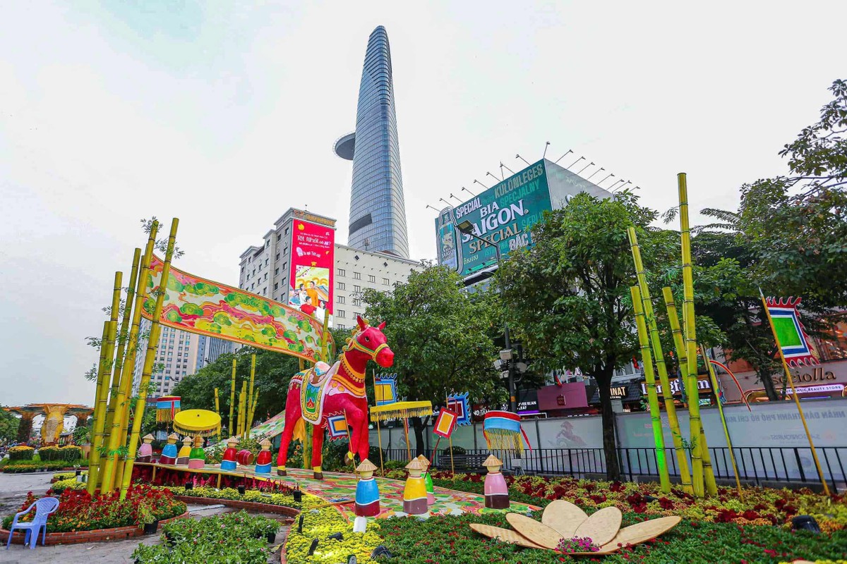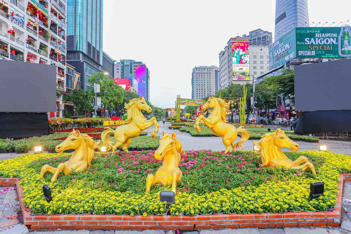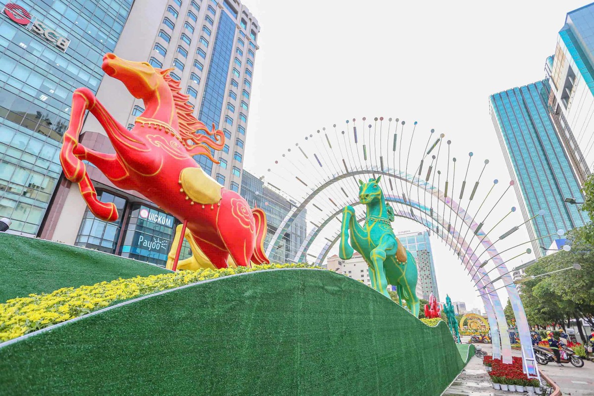 Ngay tại cổng chào hướng giao lộ Nguyễn Huệ - Tôn Đức Thắng, du khách sẽ ấn tượng với bộ ba chú ngựa mang sắc màu xanh, đỏ và vàng đặc trưng của ngày Tết.