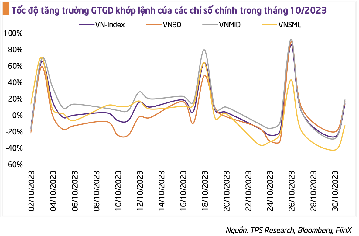 Tuy nhiên, sau nhịp điều chỉnh mạnh trong 2 tháng qua, TPS cho rằng thị trường sẽ dần khởi sắc hơn trong tháng 11/2023 với động lực chính vẫn sẽ đến từ VNMID. Bởi lẽ, VNMID đã có mức chiết khấu hấp dẫn hơn 20% từ đỉnh, trong khi các nhóm ngành chủ chốt của chỉ số như: thép (giảm 45,6%), bất động sản (giảm 46,4%) và chứng khoán (giảm 32,1%), đều đã có mức điều chỉnh vượt xa mức giảm 17,45% của thị trường chung.