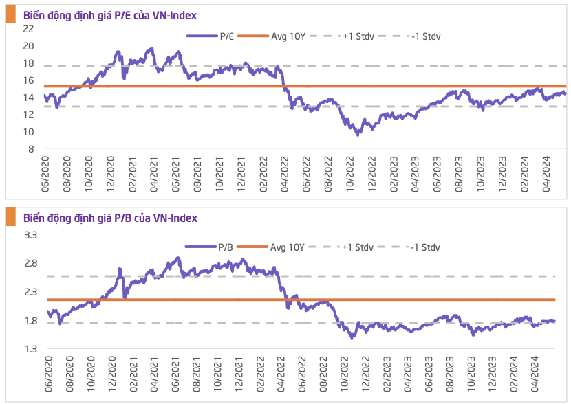 Xét về định giá, VN-Index hiện đang giao dịch tại mức P/E 14,4x. Mức định giá hiện tại vẫn còn hấp dẫn khi so với triển vọng phục hồi lợi nhuận của các doanh nghiệp trong năm nay và so với mức trung bình 10 năm là 15,2x. Định giá P/B của VN-Index hiện ở mức 1,8x và đang thấp hơn mức trung bình 10 năm là 2,2x.