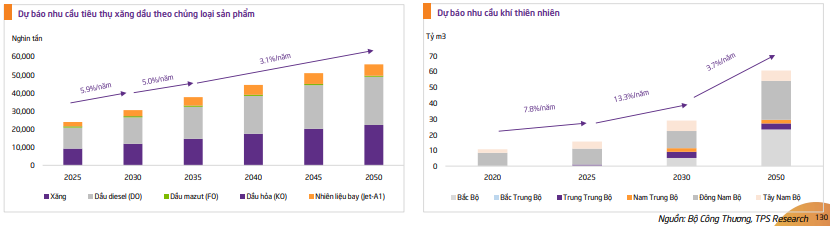 Cụ thể, nhu cầu xăng dầu dự báo duy trì tăng trưởng trong dài hạn trung bình 5%/năm đến năm 2030. Với xu thế của chuyển dịch năng lượng, thế giới nói chung và Việt Nam nói riêng sẽ hướng tới các nguồn năng lượng xanh sạch, ít phát thải ra môi trường nên sẽ hạn chế năng lượng hóa thạch như than đá, xăng dầu. Tuy nhiên, năng lượng hóa thạch vẫn đóng vai trò quan trọng cho sản xuất điện, nhiên liệu đốt và vận chuyển.