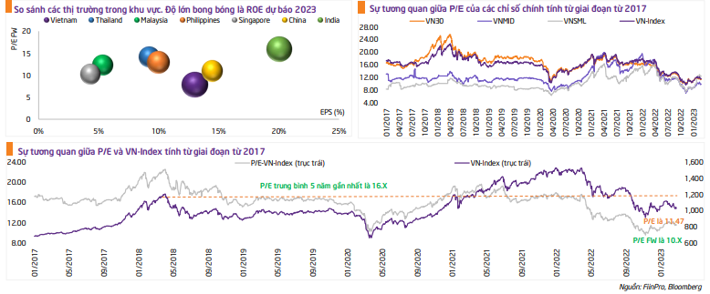 Khi so với các quốc gia trong khu vực, thị trường chứng khoán Việt Nam cũng đang hết sức hấp dẫn với P/E forward 2023 ở mức thấp, nhưng lại có mức ROE thuộc nhóm cao nhất. Chính vì vậy, các chuyên gia đánh giá, đây là thời điểm hợp lý để tích lũy những cổ phiếu có nội tại tốt hoặc kết quả kinh doanh vẫn đạt mức ổn định trong năm 2023.