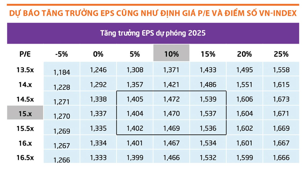 TPS dự báo, năm 2025, VN-Index có thể đạt 1.470 điểm, tương ứng với mức tăng 10% và P/E mục tiêu ở ngưỡng 15 lần, tương đương với mức trung bình 10 năm gần nhất.
