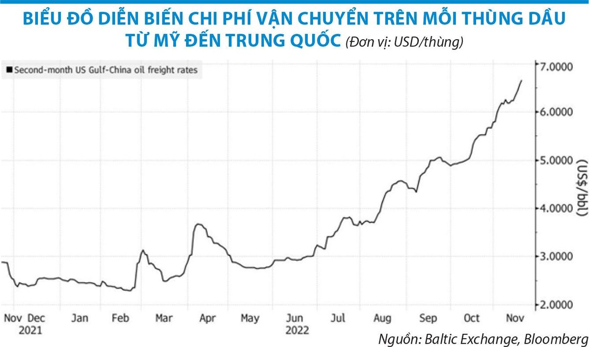 Bên cạnh đó, theo dữ liệu vận chuyển hàng hóa kỳ hạn của Sàn giao dịch Baltic do Bloomberg tổng hợp, các chuyến hàng chở dầu từ Mỹ đến Trung Quốc (một trong những tuyến đường chính có khoảng cách dài nhất trong ngành vận tải chở dầu) có chi phí vận chuyển khoảng 6,6 USD trên mỗi thùng dầu vào giữa tháng 11/2022, cao gấp gần 3 lần thời điểm tháng 2/2022. Giá cước vận tải dầu các tuyến từ Nga tới châu Á cũng tăng tương ứng trong những tháng gần đây.
