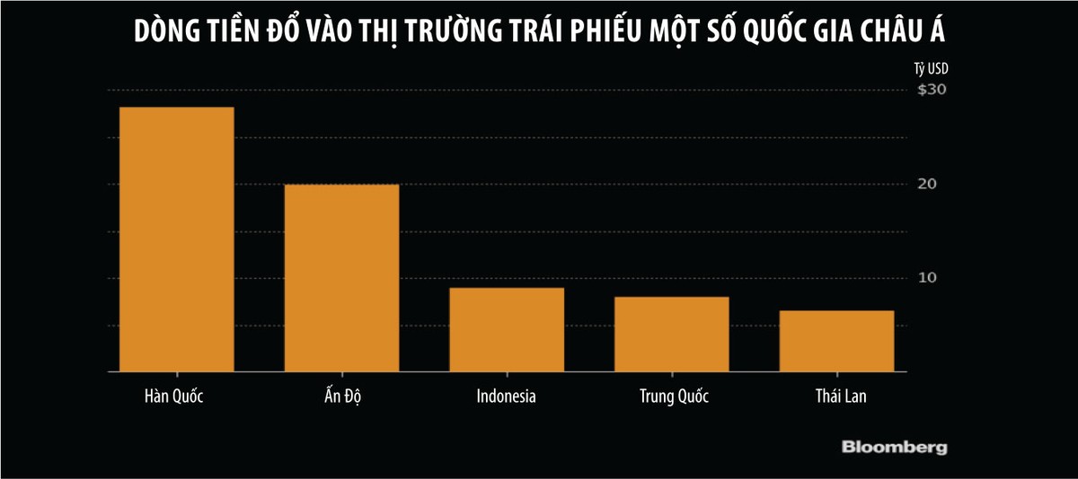Với mức sinh lợi cao gấp khoảng 2 lần so với các trái phiếu tại khu vực, cùng với quá trình cải cách nền kinh tế, các trái phiếu bằng đồng rupee và rupiah vẫn được hâm mộ bậc nhất và mang về khối lượng tiền mặt khổng lồ trong năm nay. Bên cạnh đó, trái phiếu của Hàn Quốc cũng chứng kiến dòng tiền đổ mạnh vào với giá trị khoảng 28,2 tỷ USD, bất chấp những vấn đề của riêng quốc gia này như giá cả tăng trưởng và việc nâng lãi suất.