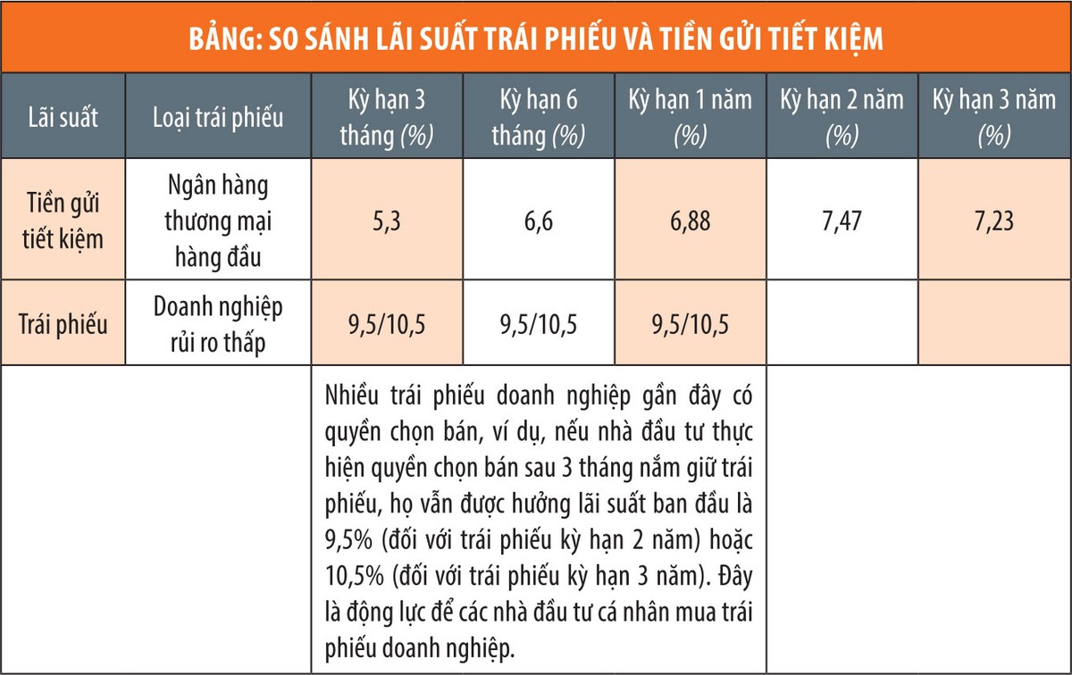 Gần đây, các nhà đầu tư cá nhân xuất hiện nhiều hơn, ước tính chiếm 10 - 15% trong tổng thị trường trái phiếu doanh nghiệp. Sức hút của trái phiếu doanh nghiệp gia tăng nhờ lợi tức được cải thiện do không ít trái phiếu được phát hành với quyền lựa chọn bán lại; nhà đầu tư cá nhân có thể bán lại trái phiếu cho doanh nghiệp phát hành sau một vài tháng nắm giữ mà vẫn hưởng được lợi nhuận như lãi suất cuống phiếu ban đầu. Ðây là một lựa chọn hấp dẫn so với sản phẩm tiền gửi tiết kiệm tại ngân hàng (xem Bảng).